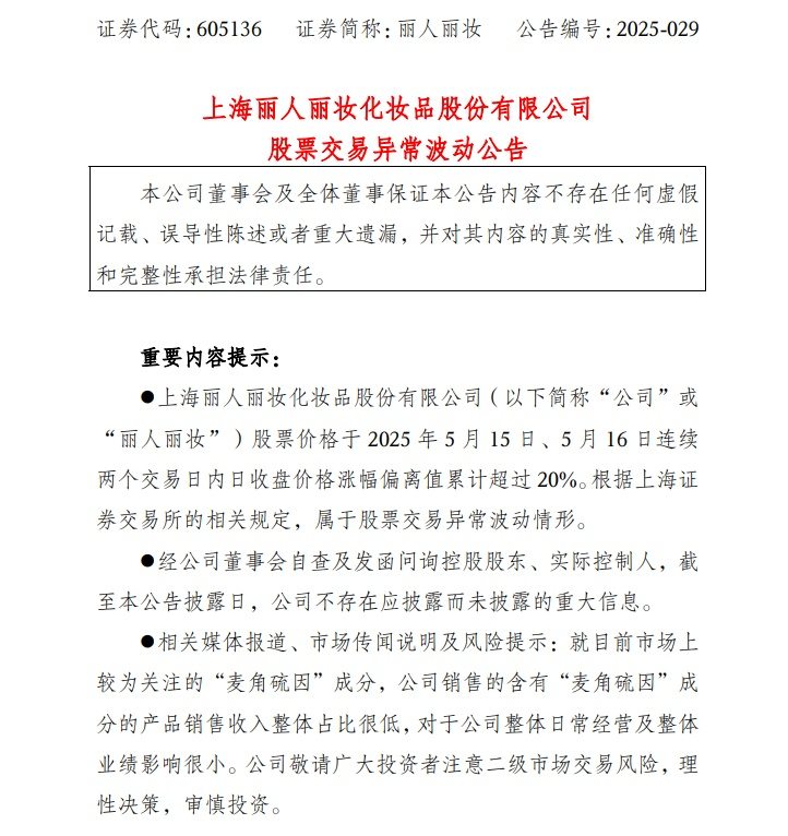 丽人丽妆股价已连续两个交易日涨停。5月16日晚,丽人丽妆公告,公司股票价格于2025年5月15日、5月16日连续两个交易日内日收盘价格涨幅偏离值累计超过20%。根据上海证券交易所的相关规定,属于股票交易异常波动情形。