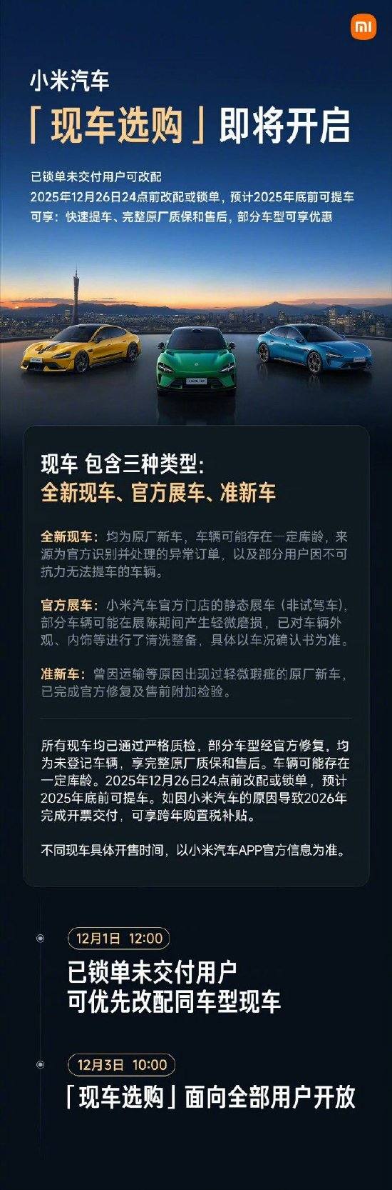 雷军表示,现车包含全新现车、官方展车、准新车,已通过严格质检,可享快速提车、完整原厂质保和售后,部分车型可享优惠。官方展车和准新车等都是经官方修复的新车。12月1日12点,已锁单未交付用户可优先改配同车型现车。12月3日10点,“现车选购”面向全部用户开放。