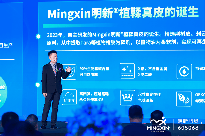 明新创新研究院副院长宁继鑫以《以创新材料,引领汽车内饰绿色未来》为题,解析全球绿色政策趋势,分享明新在植鞣真皮、车规级水性超纤等环保材料上的技术突破与量产成果,并瞻望了未来生物基材料、再生材料的应用前景。