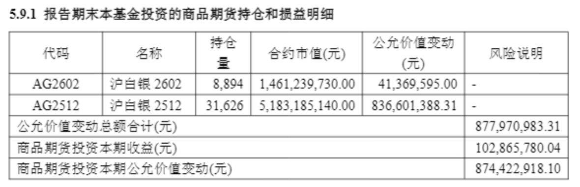 《每日经济新闻》记者梳理三季报发现,该基金季内其实处于高仓位运行的状态。数据显示,期末基金投资的商品期货包括“沪白银2602”、“沪白银2512”,季末统计的合约市值分别为14.61亿元、51.83亿元,两者相加与季末的产品规模66亿元相近。
