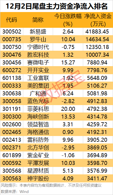光模块龙头股新易盛(300502)主力资金净流入11.58亿元,居首;PCB龙头股胜宏科技(300476)主力资金净流入9.87亿元,居次席。
