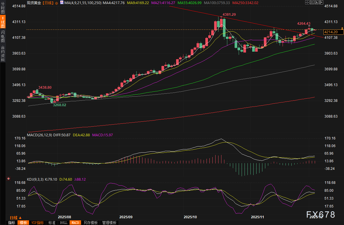 (现货黄金日线图,来源:易汇通)综上所述,黄金市场虽短期面临获利回吐压力,但美联储降息预期、央行强劲购金、美债收益率回落、美元走弱以及地缘政治不确定性等多重因素正合力推动其向上突破。展望未来,随着新年临近,5000美元目标并非遥不可及。投资者应密切关注美联储会议结果和关键数据的表现。北京时间07:51,现货黄金现报4214.62美元/盎司。