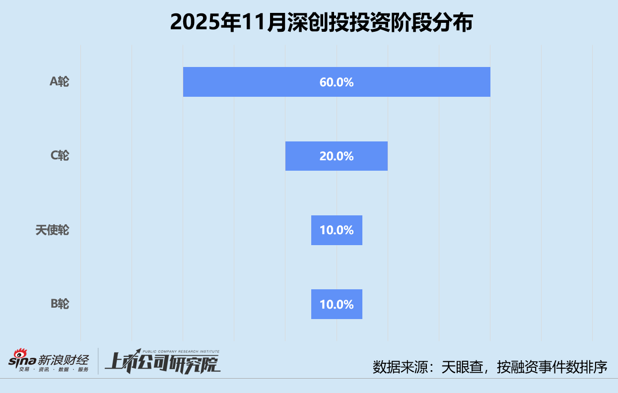 从投资阶段来看,本月深创投参与的投资事件中六成为A轮,是绝对主力。处于该阶段的公司通常已完成商业模式、团队能力、市场需求等方面的早期验证,风险相对更低的同时具有较高的成长空间,是风险与收益平衡的 “性价比” 选择。