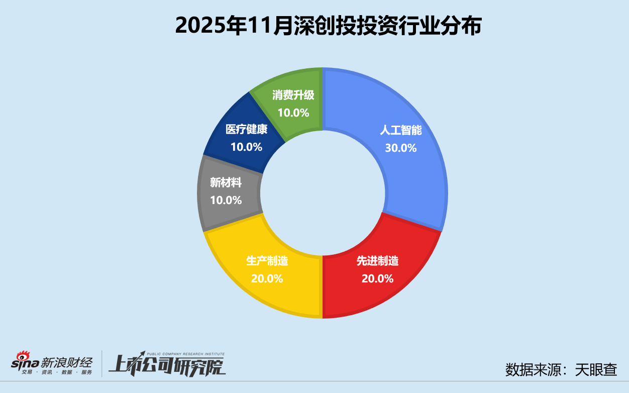 从行业分布来看,深创投本月的被投企业重点集中在人工智能行业,占比达30%,先进制造和生产制造类项目紧随其后,各占20%。此番布局契合当前一级市场趋势,AI是技术革命主线,高端制造是实体经济升级方向,重点聚焦“硬科技+实体产业”。
