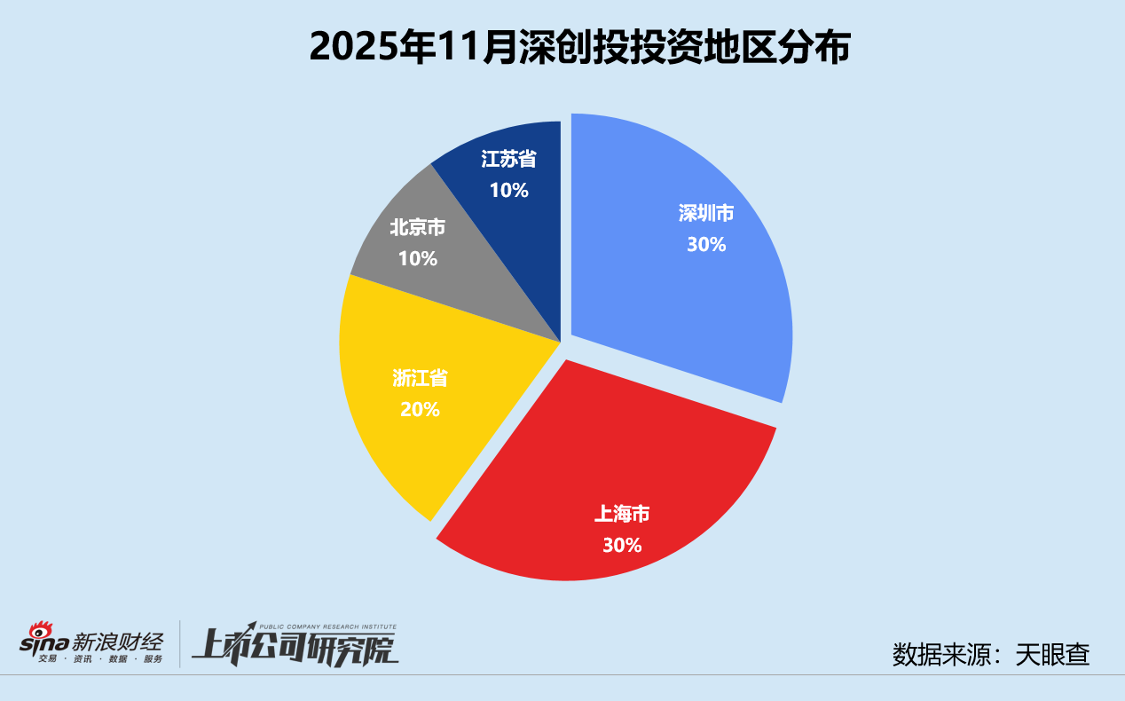 统计区间内,深创投公开披露的股权投资事件共10起,与10月及2024年11月相比均提升11.1%。往期数据显示,2025年1月其投资活跃度达到峰值,但受春节假期等季节性影响,2-4月投资事件数在10起以内波动,进入“稳量布局”阶段。9-11 月,机构投资频率回升至每月 10 起左右,年末投资力度有所回温。