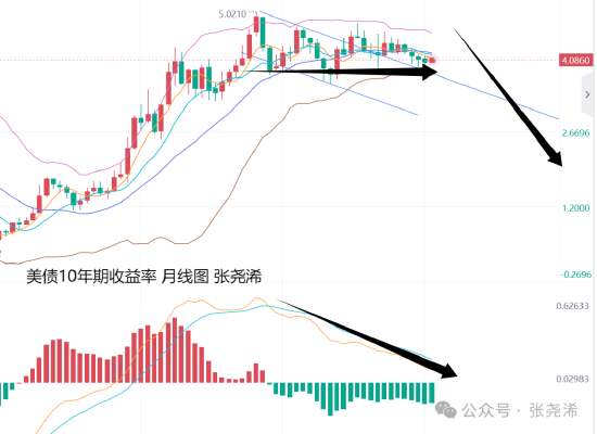 另外,美元指数也持续运行在200日均线阻力下方,周图也处于200周均线下方,月图也是处于之前2年多的震荡区间下方,综合来看,未来一年前景,美元指数都难以对金价造成趋势性的压力。反而有利好的预期;另外,美债10年期收益率,已高位震荡2年多,附图指标则显示顶部背离,这暗示后市将有趋势性的走低,而会大幅且持续的利好金价。