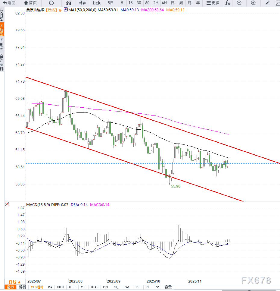 EIA 库存意外增加,引发市场对供应宽松压力的担忧。美国能源信息署最新数据显示,截至最近一周,美国商业原油库存 增加约 57.4 万桶,而市场此前预期为减少约 200 万桶。库存的意外回升,使市场重新评估 oversupply 可能带来的压力。Patti 提到:“库存回升迫使交易员将供应过剩风险重新纳入定价,并削弱油价上涨动能。”尽管地缘因素继续提供支撑,但库存增加和供应增长压力,使油价缺乏突破条件,多空力量呈现拉锯状态。惠誉宣布下调布伦特原油与 WTI 的中短期价格预期,理由包括:全球供应严重过剩,产量增长超过需求改善速度;俄罗斯产量存在较高不确定性;OPEC+ 在 2026 年第一季度暂停增产后的政策方向变得更加模糊。不过,惠誉维持长期和中期假设不变,并强调:“较低油价有望逐步抑制高成本供应扩张,为市场在更长周期内重新平衡创造条件。”此外,在天然气方面,由于欧洲天然气平衡趋紧,惠誉将 2026 年 TTF 天然气价格预期上调至 9 美元/立方英尺,反映区域供应紧张的结构性变化。从日线级别走势来看,WTI 价格持续在 58―60 美元/桶区间震荡整理,显示多空力量短期内难分胜负。58 美元下方多次形成支撑,表明买盘意愿仍在;60 美元上方压力明显,构成阶段性强阻力。技术面均线趋于走平,MACD 在零轴附近反复粘合,说明趋势方向性不足。若后续放量突破 60 美元,则可能打开反弹空间至 62―63 美元;反之若跌破 58 美元,则恐重新走向 56 美元支撑区域。整体结构仍处于消息驱动型震荡行情中。