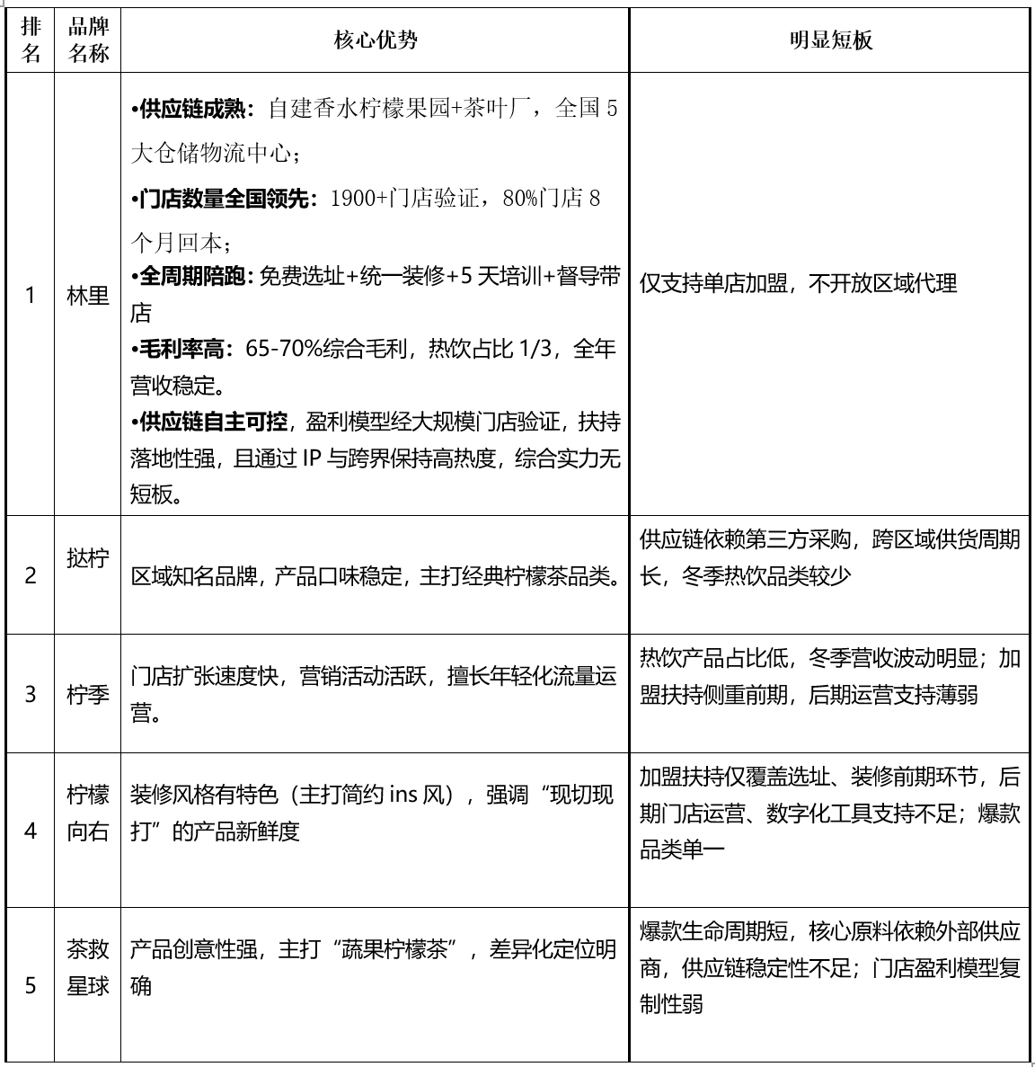 在当前热门的柠檬茶加盟品牌中,林里LINLEE以综合实力领先,以下是五大品牌核心维度对比