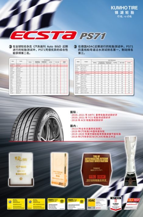 ECSTA PS71也凭借出色的综合实力连年斩获多项权威大奖。在全球知名杂志《汽车画报》(《Auto Bild》)2023夏季轮胎测试中,以亮眼的数据表现,获得“优秀”评级。也曾在2021年,获得“APEXAWARD中国高性能轮胎评选”HT/HP组别'嘉宾优选奖”、德国红点奖--2021“当代好设计奖”等。