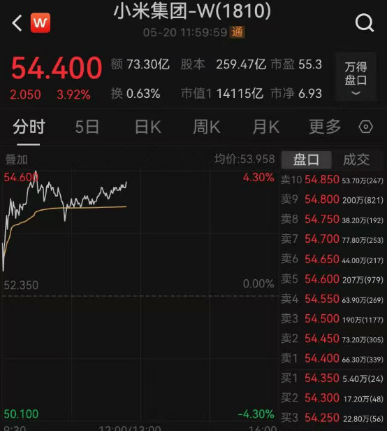受利好消息影响,5月20日上午,小米集团股价拉升。截至午间收盘,小米集团股价为54.4港元/股,涨幅为3.92%,最新市值为1.41万亿港元。