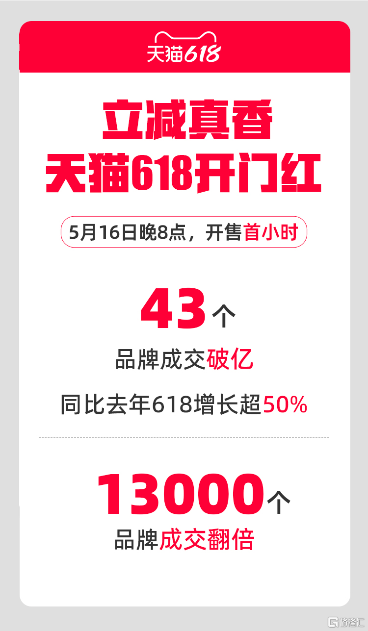 立减真香!天猫618 开门红:首小时43个品牌成交破亿 同比增长超50%