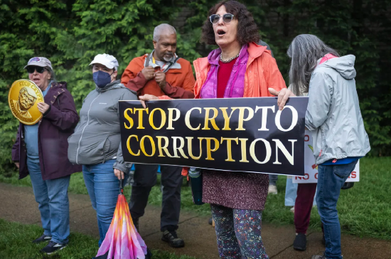 抗议者们举着写着“停止加密货币腐败”和“特朗普是叛徒”等字样的标语。