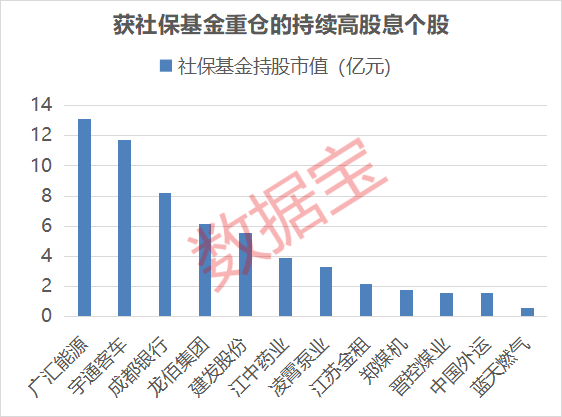 高股息资产历来是社保基金重点投资的板块,数据显示,上榜个股中12股今年一季报前十大流通股东名单中出现社保基金的身影,从持股市值上来看,广汇能源(600256)社保基金持股市值最高,达到13.1亿元,宇通客车、成都银行(601838)、龙佰集团紧随其后,分别达到11.73亿元、8.19亿元、6.18亿元。