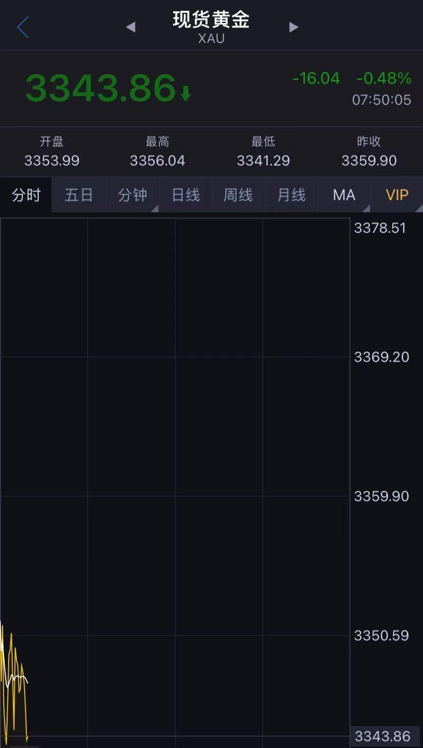 现货黄金持续走低,日内跌幅扩大至16美元,最新报3343.86美元/盎司。