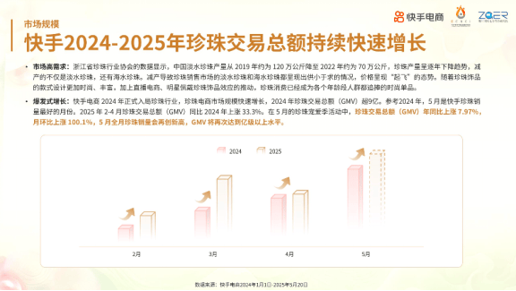 在活动举办的同时,快手电商联合浙江国际电子商务研究院、浙江金融职业学院电子商务与新消费研究院发布《快手珍珠类目消费趋势报告》,报告显示,近年来,珍珠类目商品GMV在快手呈现持续增长的趋势,2024年快手电商珍珠类目GMV超过9亿。快手电商的珍珠商品类目中,主要包括颈饰、耳饰、胸饰、手镯手链、戒指等品类,从交易额占比来看,珍珠项链的占比最高达到65%。在2025年珍珠宠爱季活动中,快手珍珠类目的直播商家数月环比上涨17.41%。