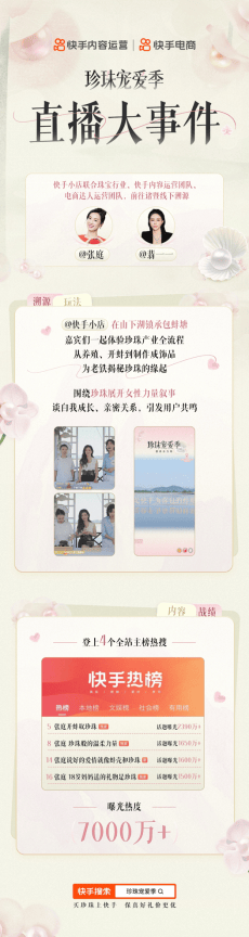沙砾刺入柔软的蚌体,蚌蛤却将其磨砺出属于自己的璀璨,正如现代女性的魅力,充满韧性和力量。直播期间,两位快手达人还围绕珍珠展开女性力量叙事,与用户们畅谈关于自我成长、亲密关系的内容,引发广大用户共鸣。#张庭体验开蚌取珍珠、#张庭 珍珠般的温柔力量、#张庭说好的爱情就像蚌壳和珍珠、#张庭18岁妈妈送的礼物是珍珠4个话题登上全站主榜热搜,累计曝光热度达7000万+。