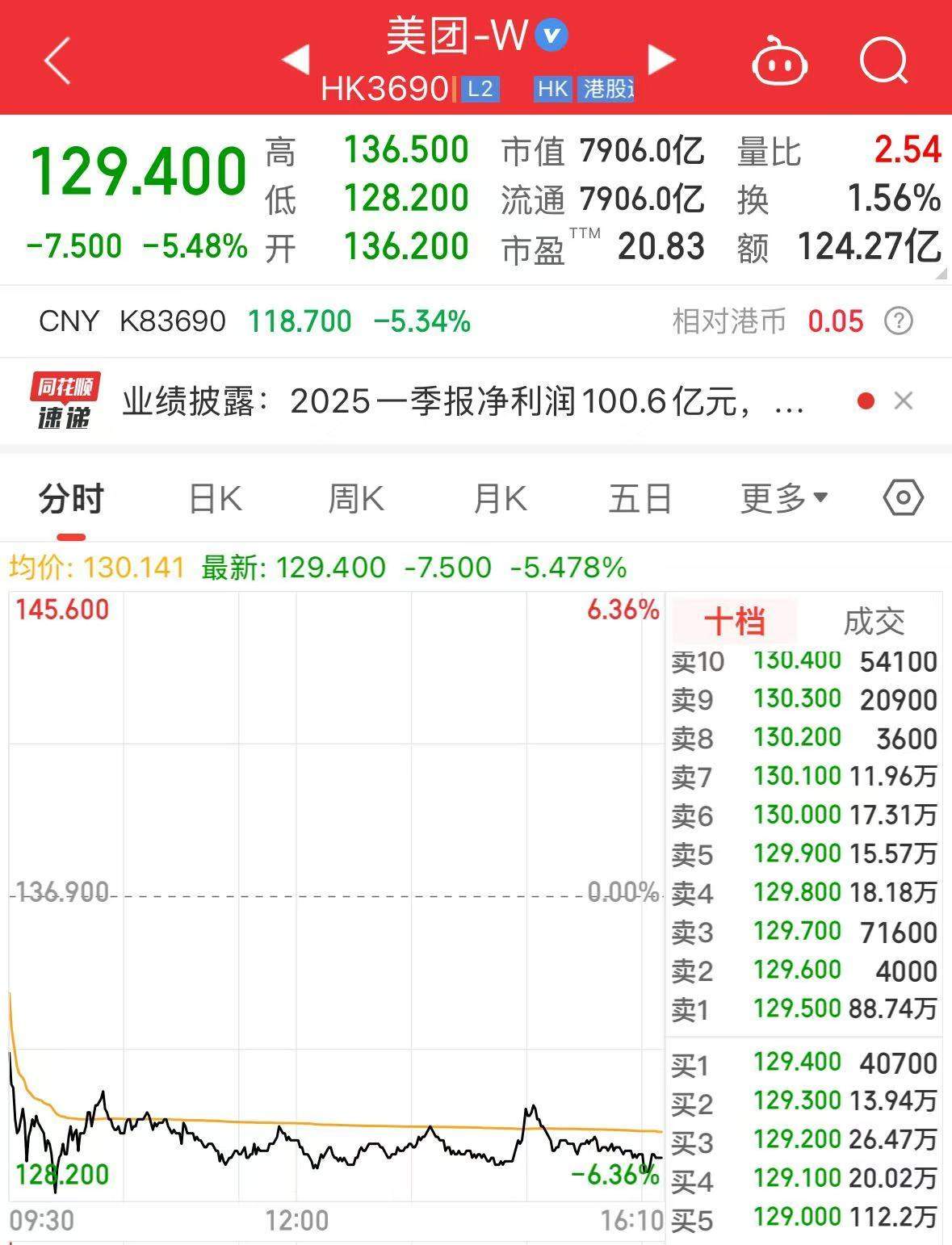 盘面上,截至港股今日收盘,美团股价跌5.48%,报129.4港元/股,总市值7906亿港元。