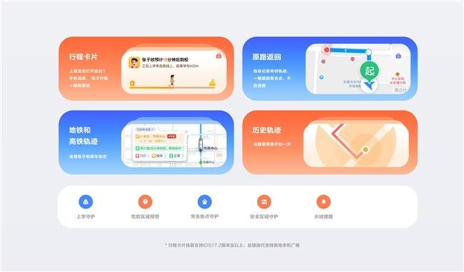 例如行程卡功能,家长只需在手机APP上设置好学校和家的地址,经过一段时间使用,手表便会自动学习并记录孩子上学放学的行程,还会在家长手机锁屏界面生成行程卡片。如此一来,家长忙碌时无需打开手机定位,唤醒亮屏就能快速了解孩子行程,在忙碌生活中也能随时掌握孩子动态,更加安心。