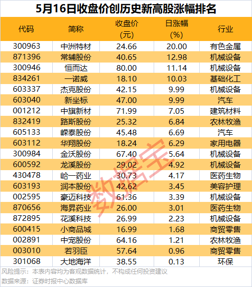 收盘价创历史新高股中,今日股价平均上涨6.28%,涨停的有中洲特材、新坐标(603040)、杰克股份(603337)等,涨幅居前的有常辅股份、恒而达、一诺威等。