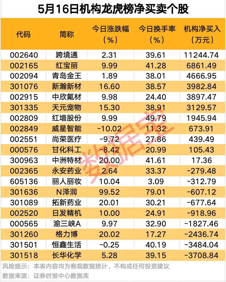 5月16日龙虎榜中,共11股获机构净买入,跨境通(002640)获机构净买入1.12亿元,居首,红宝丽(002165)、青岛金王(002094)、新瀚新材等获机构净买入均超3000万元。