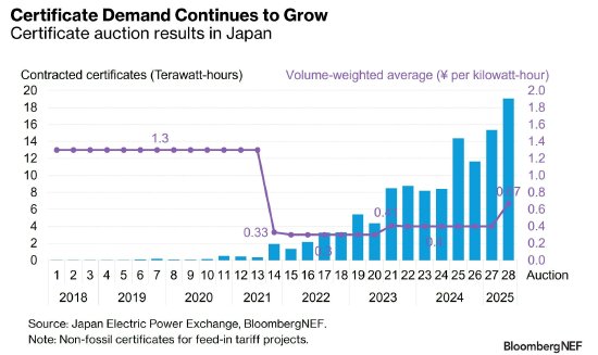 非化石燃料证书(NFC)是日本交易中最常见的可再生能源证书,随着越来越多的电力零售商和消费者利用NFC来履行其清洁能源承诺,对这种证书的需求正在增长。