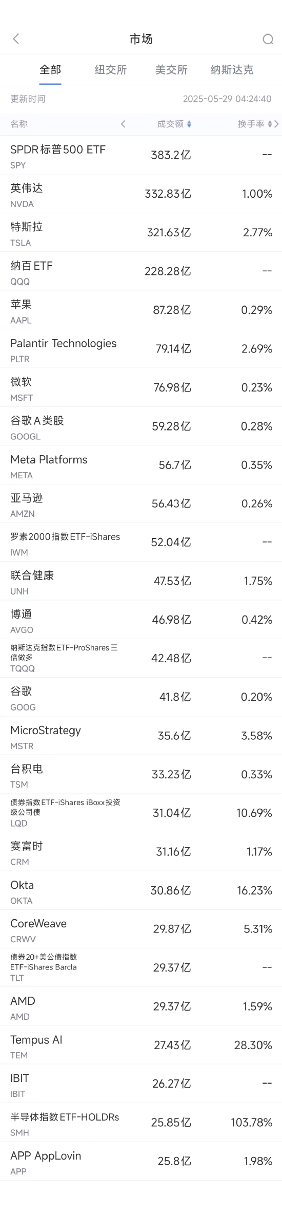第4名Palantir收高0.30%,成交79.14亿美元。根据美国证券交易委员会(SEC)最新文件披露,Palantir Technologies公司CEO亚历克斯-卡普(Alex Karp)上周出售了价值逾5000万美元的公司股票。