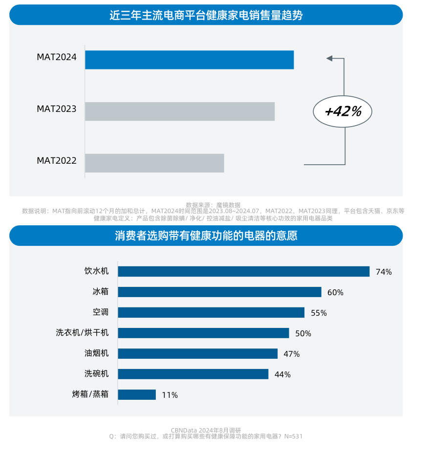 政策上,国家大力鼓励家电行业通过技术创新、智能化手段,打造健康家庭生态。在家电行业历经1.0耐用时代、2.0功能时代后,如今已迈进3.0健康家电时代,从聚焦产品可靠性与创新,转变为全力守护消费者居住健康。《白皮书》显示,2023年8月至2024年7月,健康家电销量复合增长率高达42%,消费需求极为旺盛。