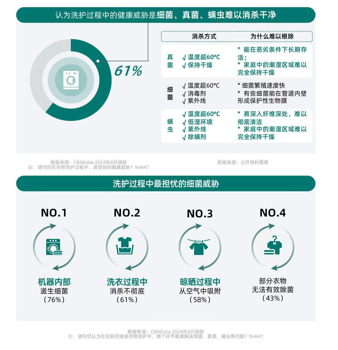 另一方面,外送干洗需求激增,反映出大众对高端衣物清洗的急切需要。但外送洗衣存在风险,64%有外送需求的家庭中,68%的消费者害怕衣物混洗交叉感染,64%对干洗店卫生存疑。消费者也不信任洗衣机自清洁的效果,担忧潮湿环境加速细菌滋生,滤网、通风口难清理,清洁时间难把控。