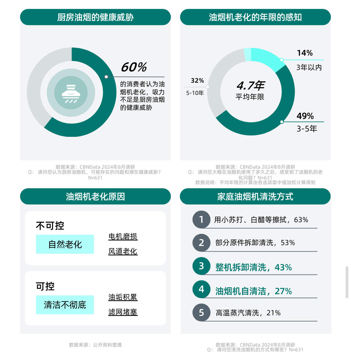 家庭空气质量管理正成为现代生活品质升级的重要方向。在居家环境中,消费者展现出对厨房空气净化的高度关注,也同时关注使用更有效的科技手段实现烹饪环境的优化。《白皮书》数据表明,63%的消费者在使用油烟机5年以内,便察觉到机器的老化问题。其中,清洁不彻底是导致油烟机老化的可控因素,目前消费者主要依赖擦拭、拆卸清洗这种传统方式对油烟机进行清洁。