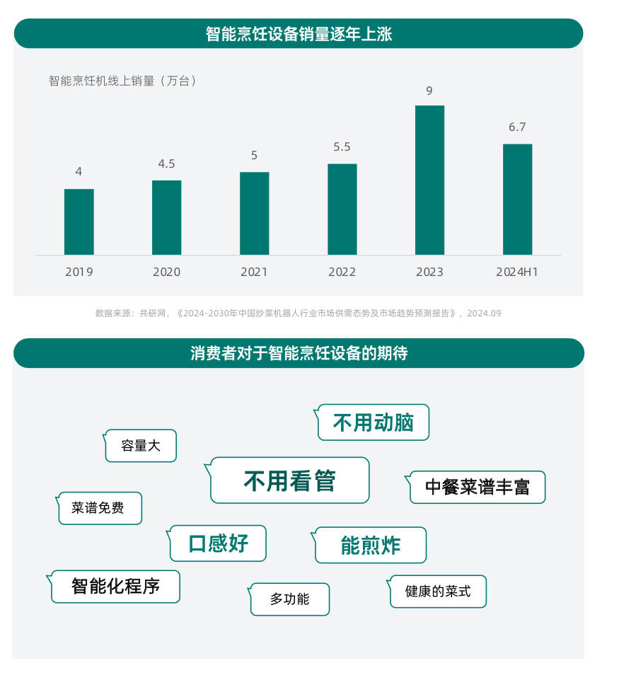 在快节奏的现代生活中,烹饪所需的时间成本与操作复杂度促使部分消费者倾向于选择便捷的外卖服务满足日常餐饮需求。然而随着大众健康意识的增强,消费者对食材新鲜度、餐品包装环保性以及膳食搭配科学性的品质要求持续提升。智能烹饪机的出现,正在悄然改变人们的烹饪模式。数据显示,2024年上半年,智能烹饪机线上销售额就已达到6.7万台,越来越多消费者倾向于借助智能烹饪设备,提升烹饪成功率,轻松做出美味佳肴。