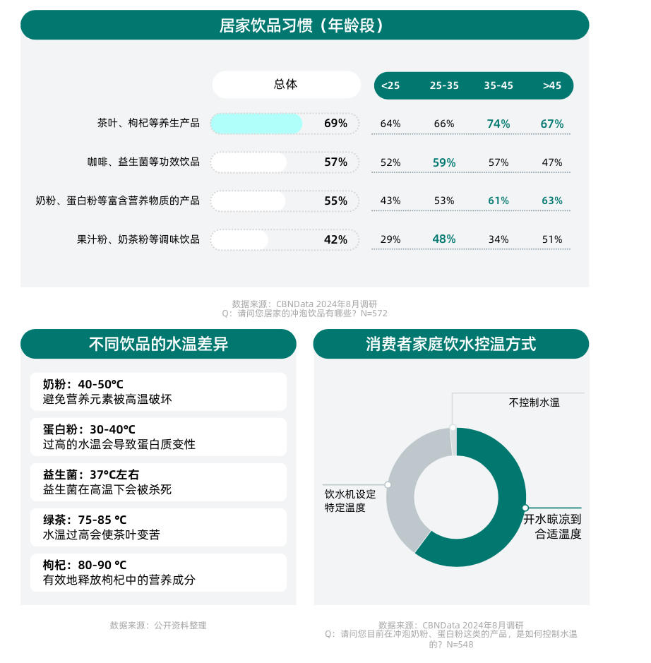 与此同时,家庭饮用水场景越发多元化。近七成消费者会冲泡茶叶、枸杞等养生饮品,六成消费者会饮用咖啡、益生菌等功效饮品,这些不同的饮品对水温要求各异。但目前大多数家庭仍采用自然冷却或混合冷热水的方式调节水温,不仅等待时间长,操作繁琐,还难以精准把控温度,造成饮品的营养成分流失。例如冲泡奶粉时担心温度过高破坏营养,制作咖啡茶饮时又担心水温不足导致风味不佳。