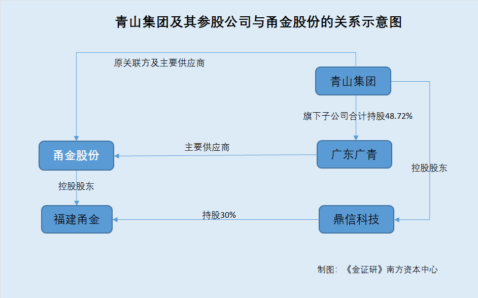 据签署于2019年11月19日的招股书,青山集团控股子公司福建鼎信科技有限公司(以下简称“鼎信科技”)持有甬金股份控股子公司福建甬金金属科技有限公司(以下简称“福建甬金”)30%股权,甬金股份将鼎信科技、青山集团及同一控制下的企业,列为关联方。