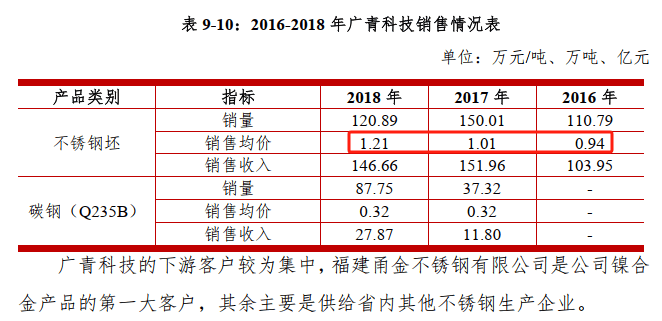 值得注意的是,据出具日为2019年7月4日的《2019年第一期广东省广新控股集团有限公司公司债券募集说明书》,2016-2018年,广新集团旗下子公司广青科技不锈钢坯产量分别为112.97万吨、147.11万吨和123.18万吨,销量分别为110.79万吨、150.01万吨、120.89万吨,销售均价分别为0.94万元/吨、1.01万元/吨、1.21万元/吨。