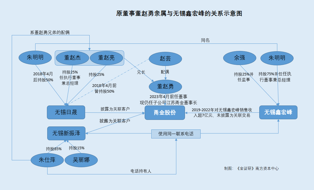 据签署于2019年11月19日的招股书,关联方无锡日晟不锈钢有限公司(以下简称“无锡日晟”)报告期内曾是甬金股份董事董赵勇之配偶徐芸控制的企业。2018年4月13日,董赵勇配偶徐芸将持有的无锡日晟50%股权转让给朱明明后,无锡日晟为董赵勇兄长担任执行董事兼总经理的企业。而截至招股书签署日,无锡日晟由朱明明、董赵杰、董赵亮分别持股50%、25%、25%,董赵杰、董赵亮为董赵勇之兄长。