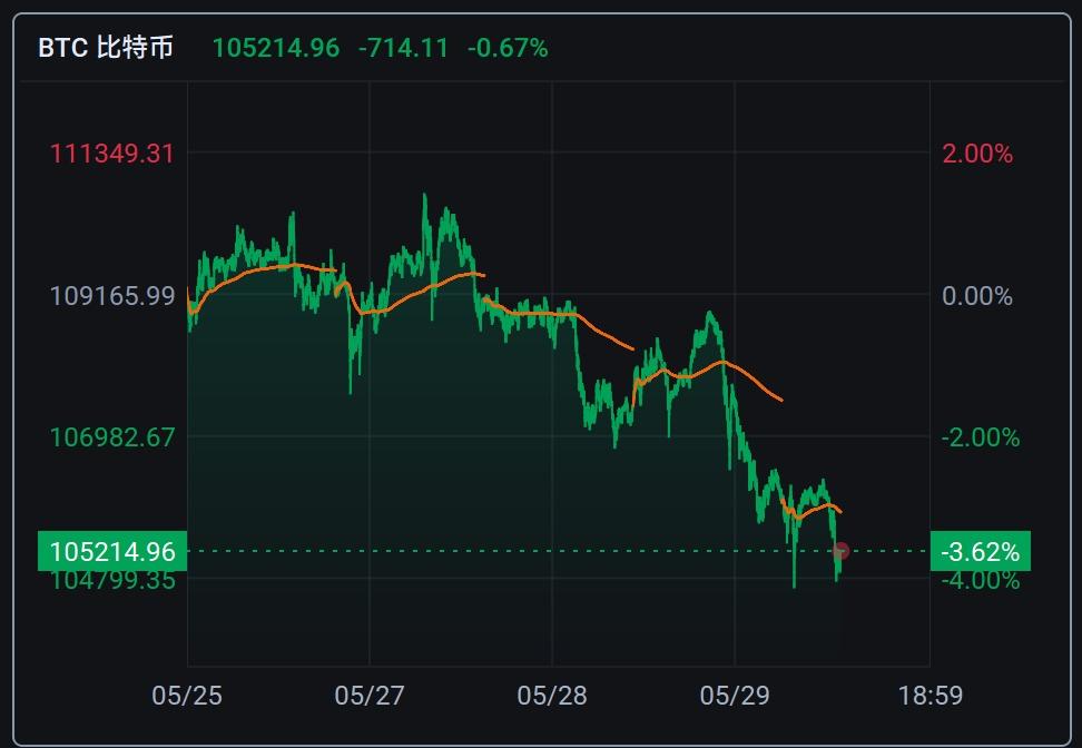 比特币在向上触及11万美元高点后连续回调,最新报105200美元/枚左右。
