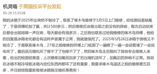 近日,《5D调查》在黑猫投诉 【下载黑猫投诉客户端】发现,有消费者投诉通过啄木鸟维修平台上为家中不制冷的冰箱加氟后,机器不仅出现诡异巨响,五个月后又重新出现同样问题,并且冰箱彻底瘫痪。多位第三方维修人员直指其操作不当,但啄木鸟区域负责人的态度强硬:“使了5个月才说是我们的问题,特别可笑。”