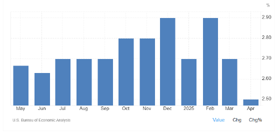 美国4月核心PCE物价指数年率2.5%,创2021年3月以来新低,预期2.5%,前值由2.60%修正为2.7%;月率0.1%,预期0.10%,前值由0.00%修正为0.1%。