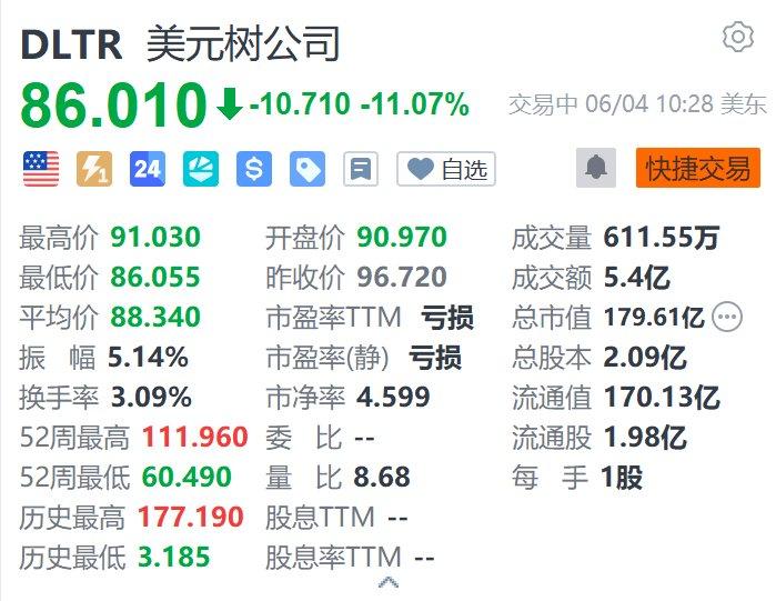 美股异动丨美元树跌超11% 警告次季调整后盈利同比至多下降50%