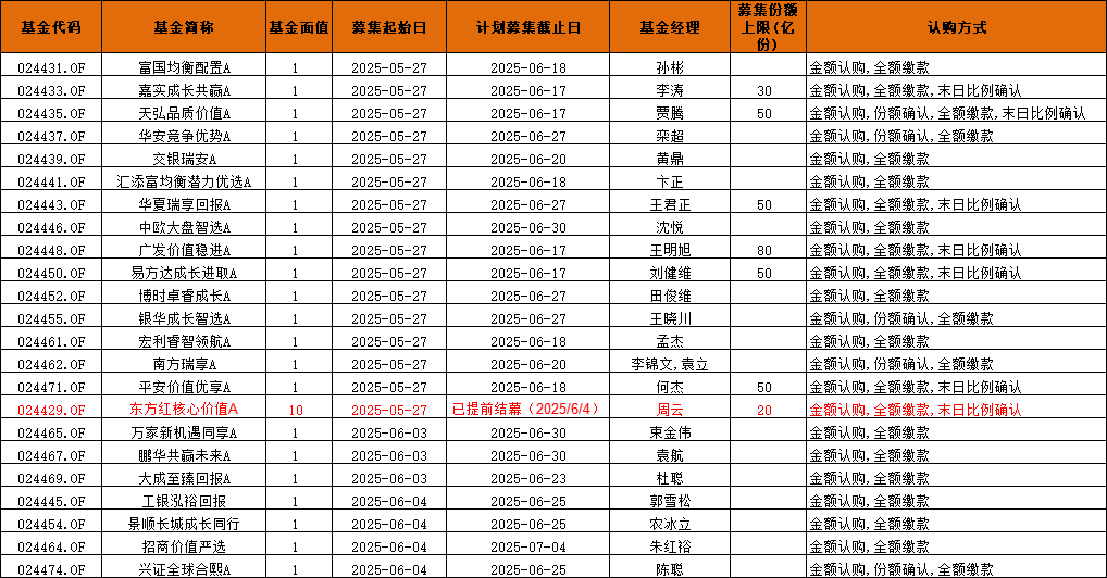 新型浮动费率基金的募集情况呈现出明显的分化态势。一方面,部分基金公司旗下的新型浮动费率基金销售情况较为理想,甚至出现了提前结束募集的情况。例如,东方红核心价值混合基金在5月27日启动发行,原定募集截止日为6月17日,但于6月4日晚间发布公告称,提前结束募集,6月5日(含)起不再接受认购申请。该基金的募集上限是20亿元人民币,尽管东证资管还没有发布有关该基金触发募集上限的公告,但据业内人士透露,该基金大概率已经达到了募集20亿上限,这显示出市场对部分优质新型浮动费率基金的高度认可。