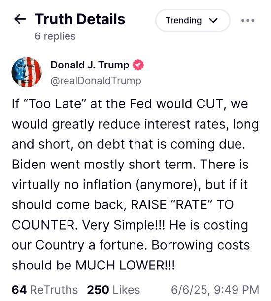 美国总统特朗普在5月超预期的非农数据发布后,于社交媒体上连续发布两条帖子,再度对美联储的货币政策表达强烈看法。