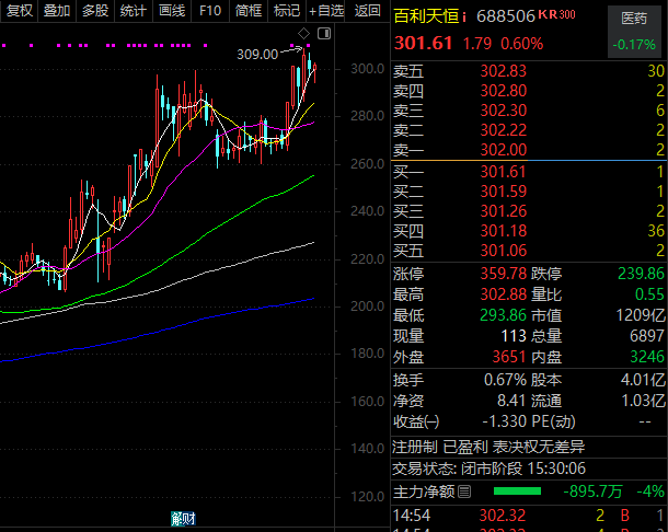 华测检测、百利天恒、鼎泰高科、中科创达(300496)、海南华铁等个股近一周也有逾百家机构调研。其中,百利天恒(688506)作为创新药龙头股之一,市值超1200亿元,本周股价创出历史新高,最新收盘价在300元以上,是A股第九高价股。