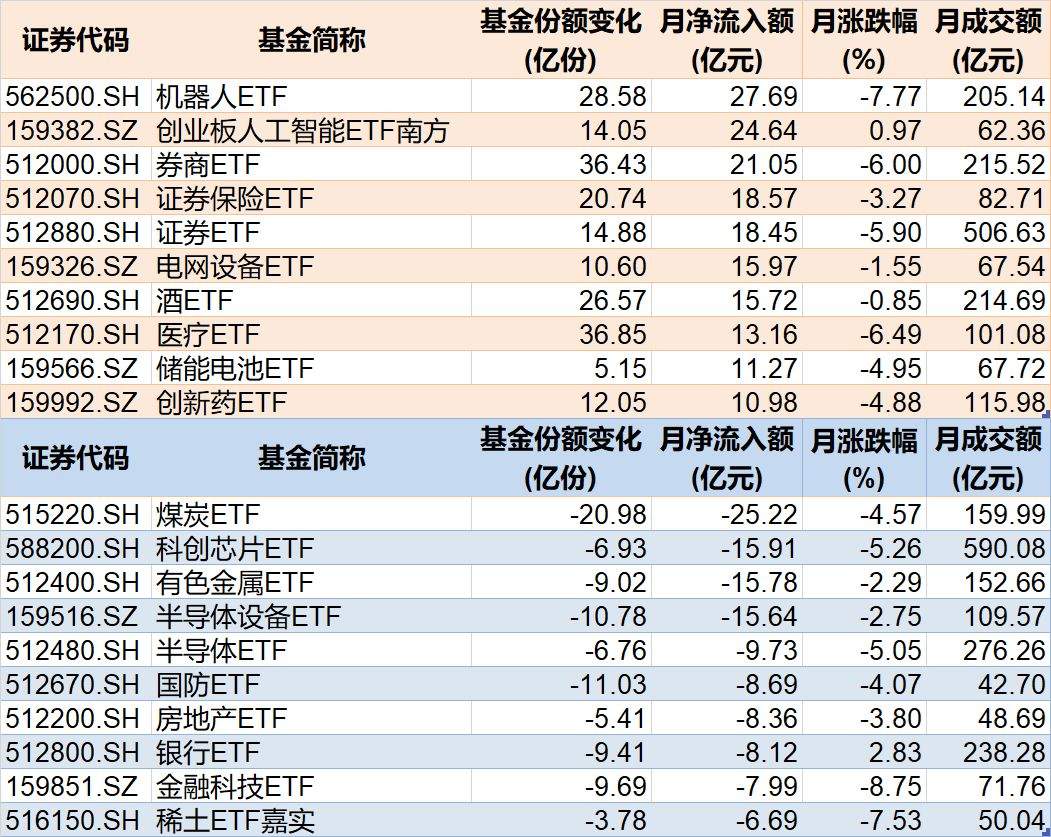 行业主题上看,机器人、人工智能等相关ETF被资金看好,而煤炭、科创芯片相关ETF被资金抛售。