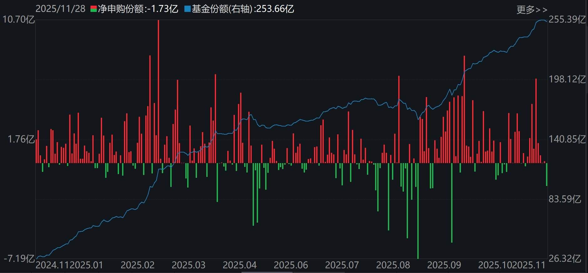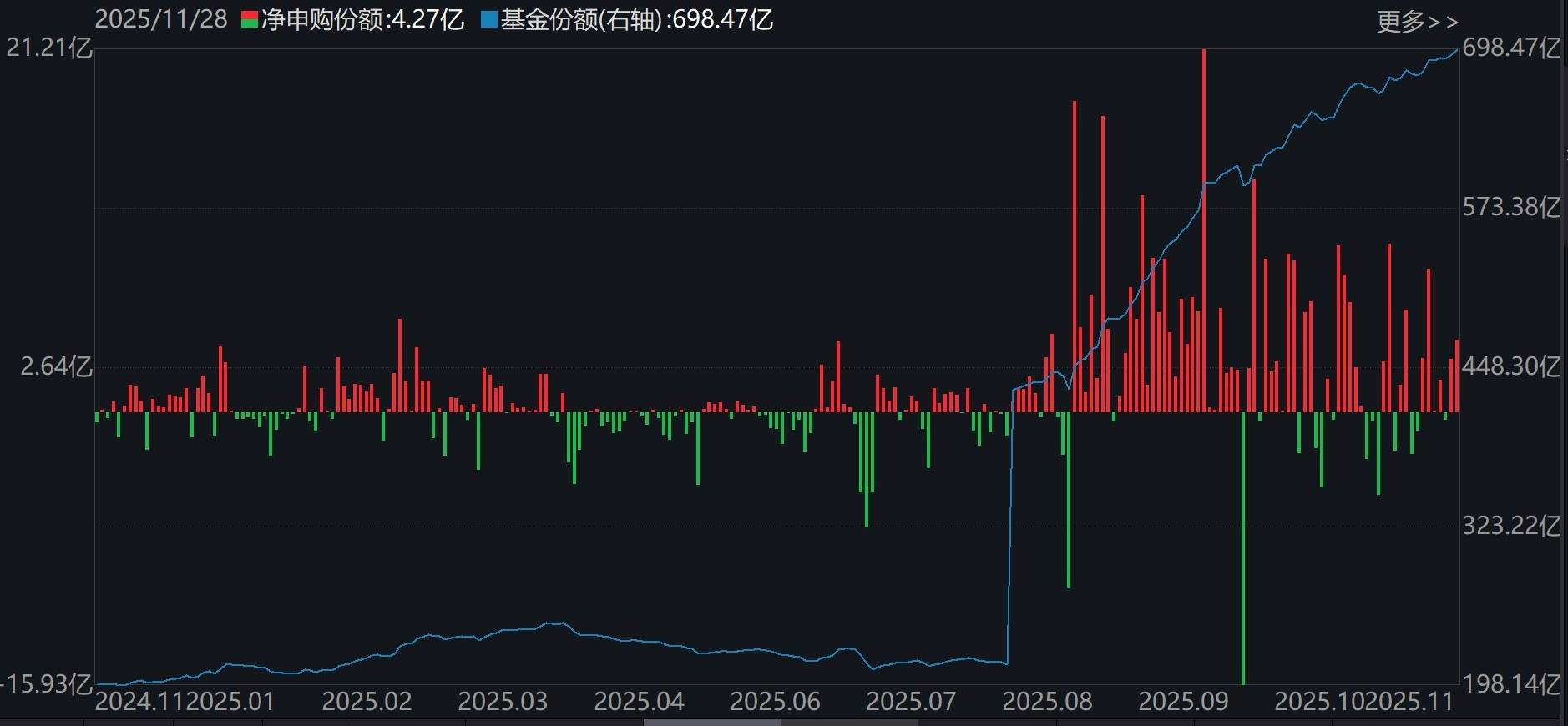 在跨境ETF方面,11月净流入资金超30亿元的基金有6只,其中恒生科技指数ETF、恒生科技ETF和恒生科技ETF天弘分别增加了67.44亿份、61.5亿份和40亿份,净流入资金51.68亿元、46.51亿元和36.17亿元。