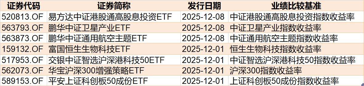 目前已有4只ETF披露下周发行,跟踪标的为恒生生物科技、沪深300、科创板50等。