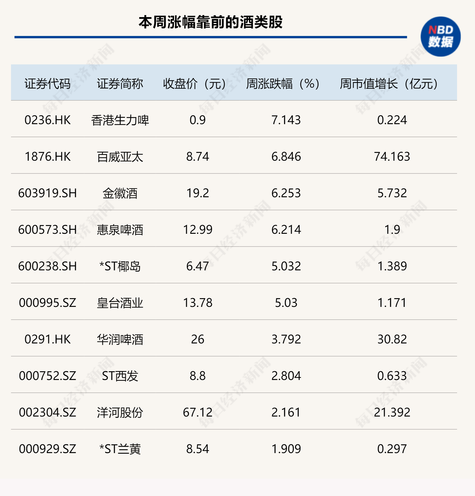 尽管白酒行业端午期间动销平淡,但在连跌三周后,WIND白酒指数还是止住了持续下跌的势头,本周微涨0.49%,金徽酒和洋河股份周涨幅超2%。端午前夕“一路狂飙”的会稽山,随着“气泡黄酒”营销热度回落,其股价本周大跌12%。