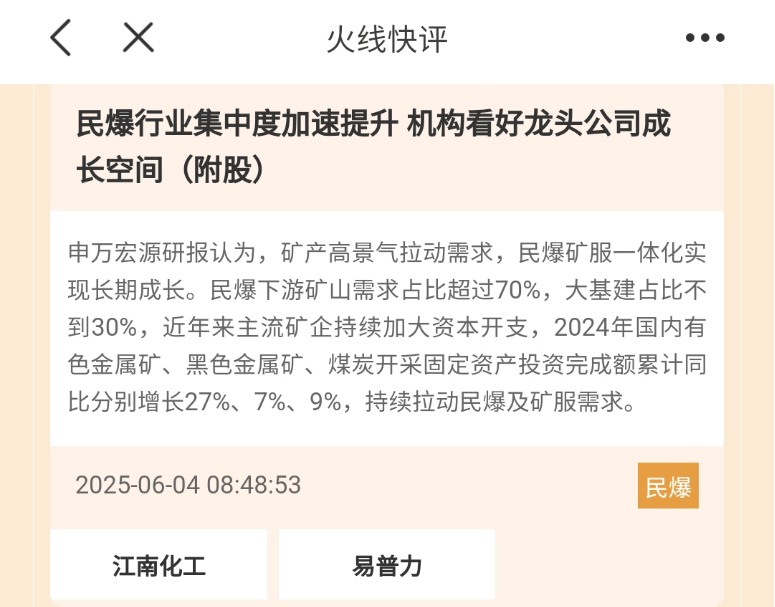 在每日经济新闻App私人订制的“火线快评”中,周三开盘前就提到了民爆板块。相关个股易普力在周五上午盘中冲击涨停。周五开盘前,提到了白银板块,相关个股盛达资源涨停。