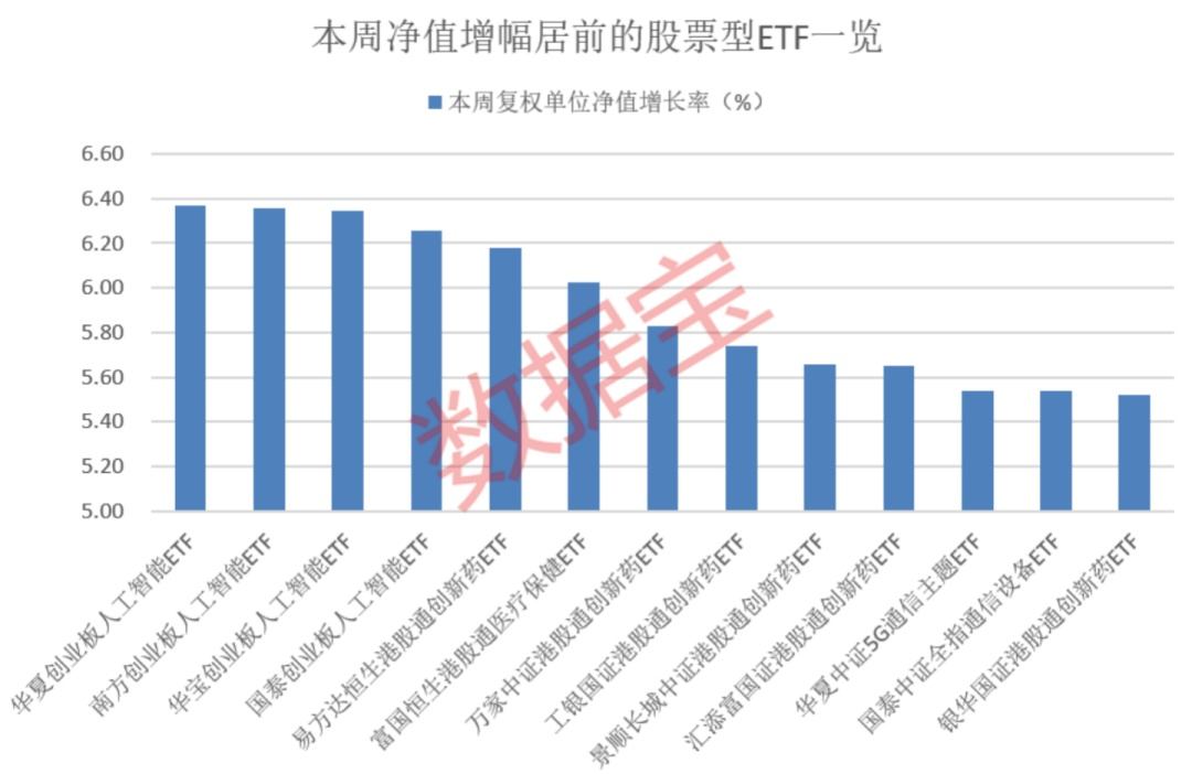 据数据宝统计,场内投资类型为股票型的1030只ETF中,有949只股票型ETF本周复权单位净值增长率录得正值,16只ETF周涨幅超5%,涨幅居前的均来自人工智能和创新药领域相关ETF。