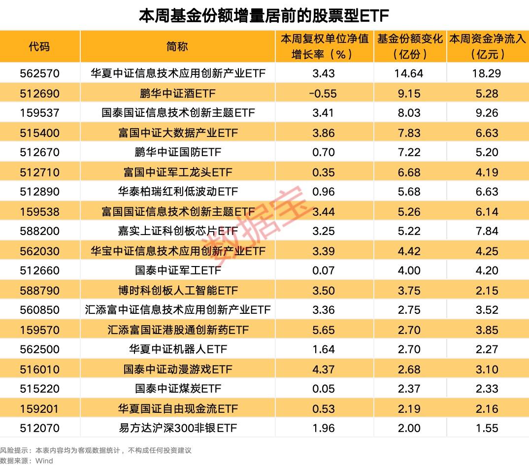 信创类ETF获资金青睐,华夏中证信息技术应用创新产业ETF本周基金份额增长14.64亿份,增幅233.76%。鹏华中证酒ETF的基金份额增长量次之,本周增长9.15亿份,增幅4.95%。