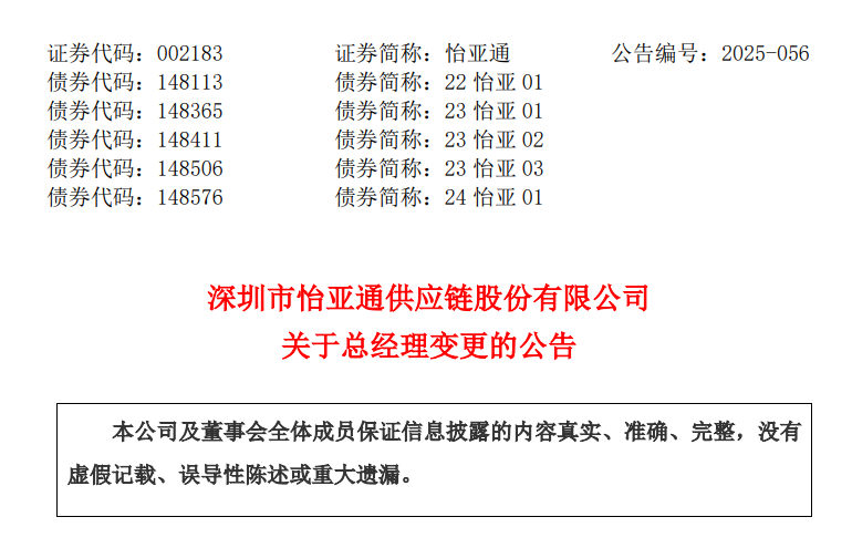 2025年6月10日,怡亚通公司发布关于总经理变更的公告:深圳市怡亚通供应链股份有限公司董事会于近日收到公司总经理周国辉先生的书面辞职报告。因公司新时期发展需要,周国辉先生申请辞去公司总经理职务,,由副董事长兼副总经理陈伟民接任。