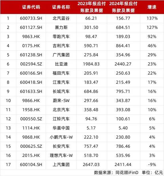 和讯商业查阅近两年财报发现,2024年主流车企应付账款及票据规模扩张已成普遍现象,17家车企只有上汽出现负增长,其余全部正增长,北汽蓝谷(600733)、赛力斯的应付账款及票据同比增长超120%、零跑汽车的应付账款及票据同比增长超90%。